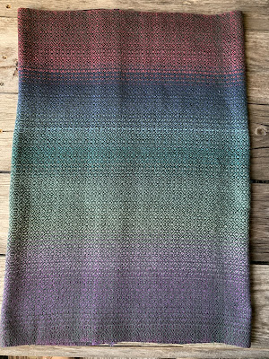 This one and the one below it were the smallest at 33-inches wide. Both of these used 5/2 cotton. The one below shows where I changed weft colors while weaving. I left it as it. I thought it added interest.